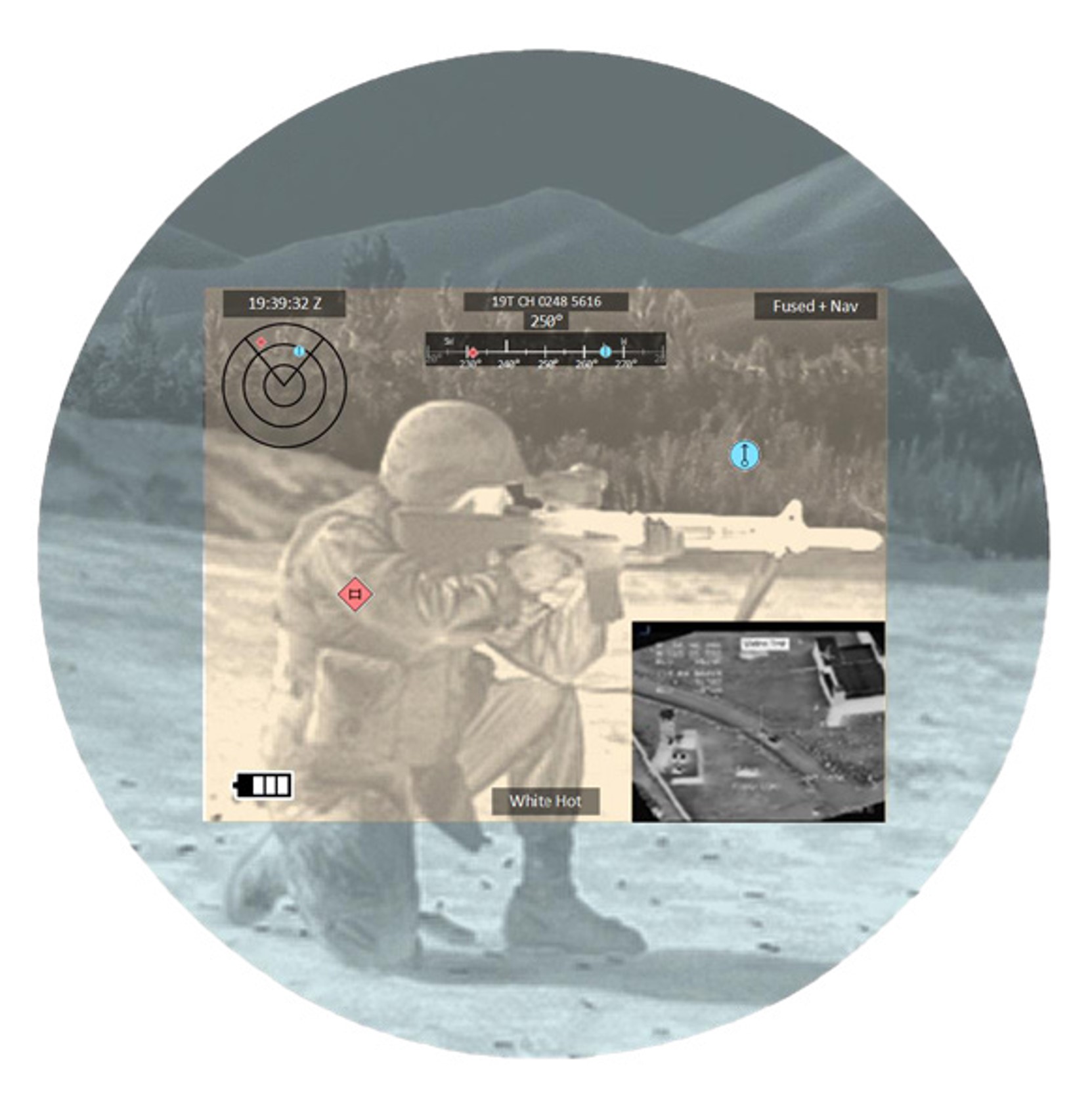 Provides targeting and identification in all battlefield conditions and light levels. Smart battery pack adds wireless communications, Rapid Target Acquisition (RTA) and Augmented Reality (AR). Uses image intensification technology fused with thermal imagery; thereby, bridging the gap in performance and capability for both of these sensors.